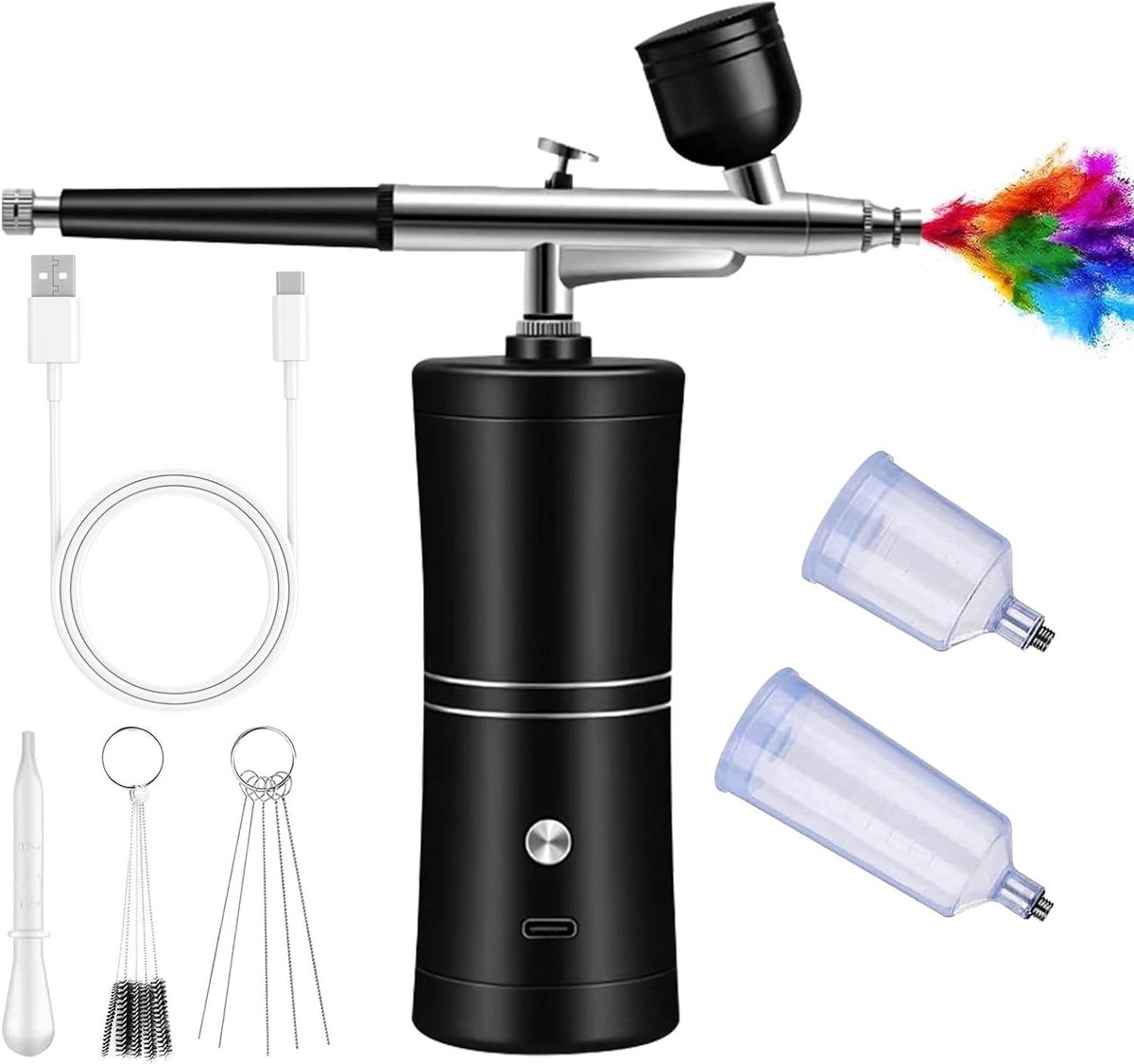 Compacte airbrush-set voor het schilderen en afwerken van 3D-geprinte miniaturen en modellen.