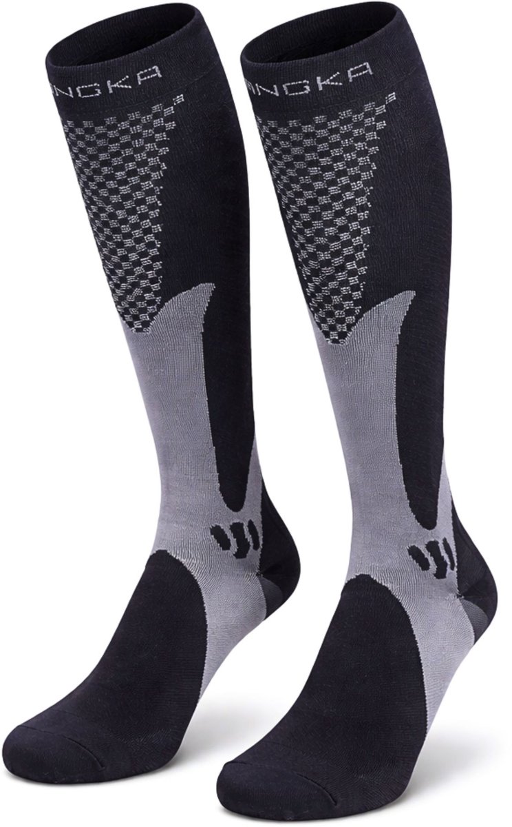 Basketbalspecifieke sokken met extra demping op hak en bal, compressie in de middenvoet en een nauwsluitende pasvorm geven comfort en voorkomen blaren bij lange spelsessies in strakke basketbalschoenen.