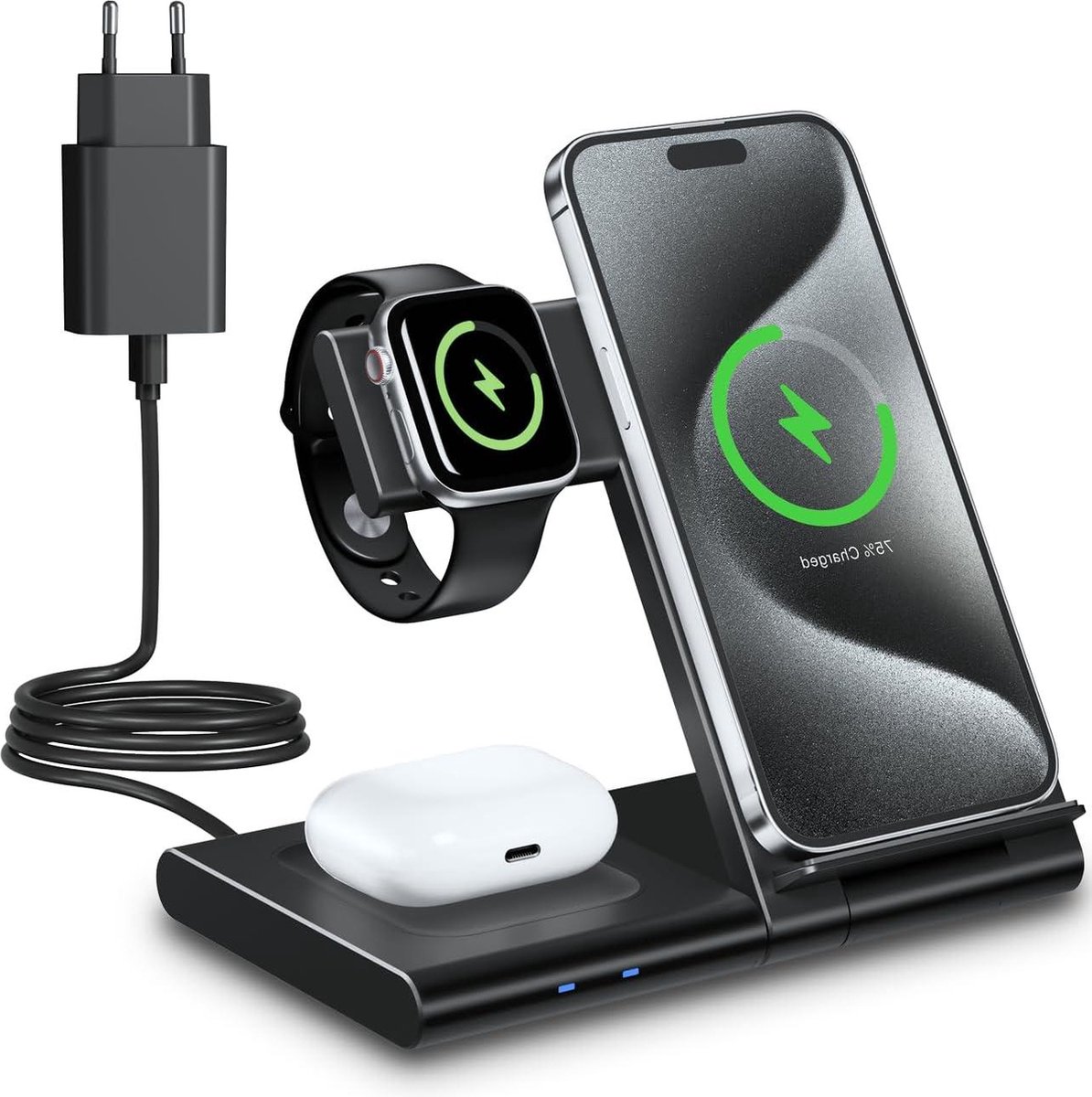 Oplaastation voor tegelijk opladen van telefoon, earbuds en smartwatch