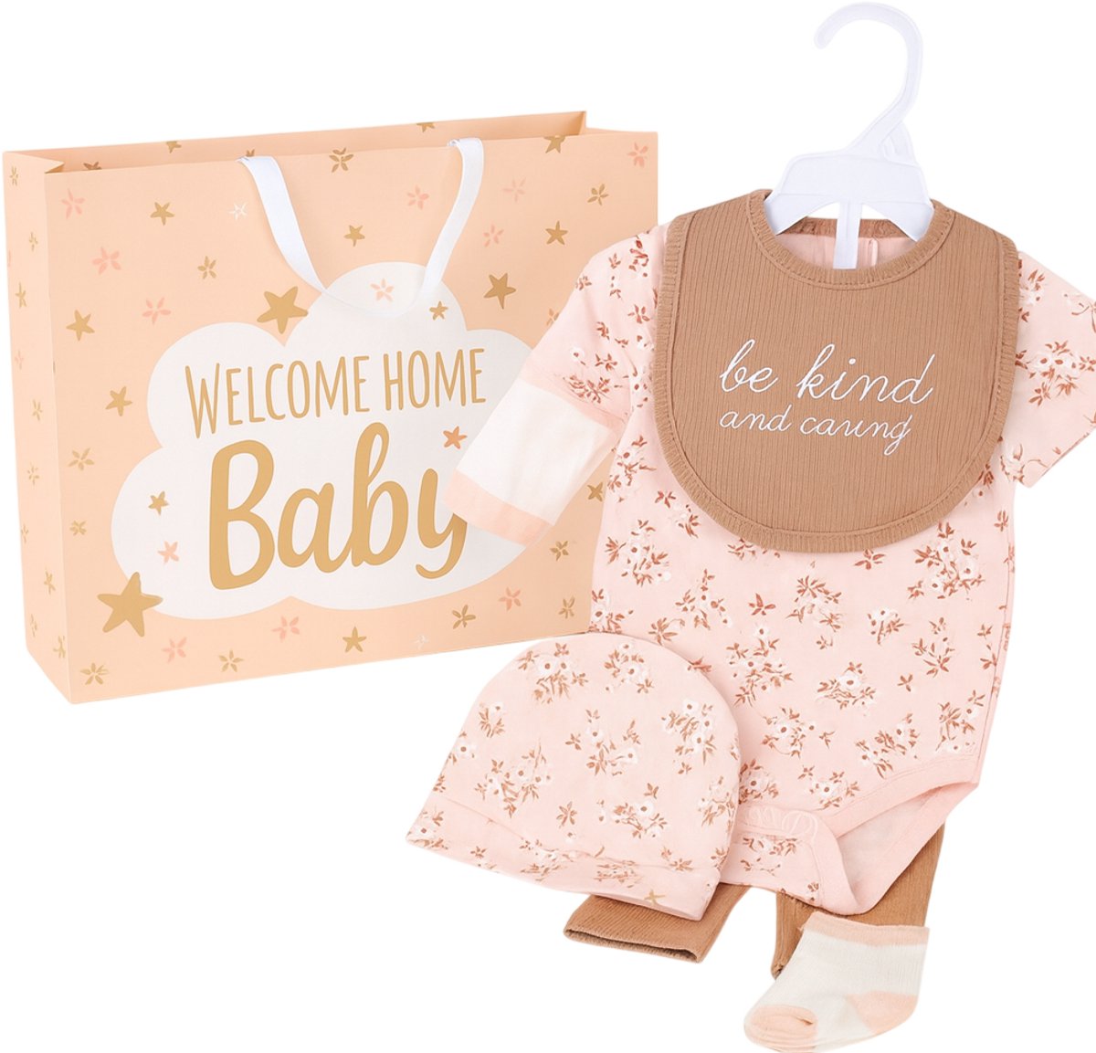 Complete newborn kledingset: romper, mutsje, sokjes en slabbetje in cadeauverpakking