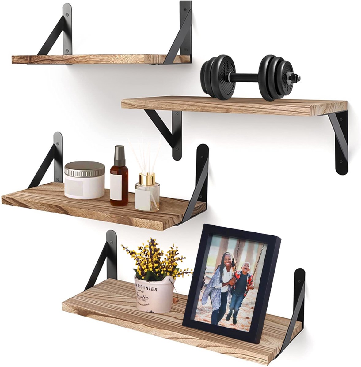 Rustiek houten wandrek met industriele accenten — ideaal voor boeken, objecten of curiosa.