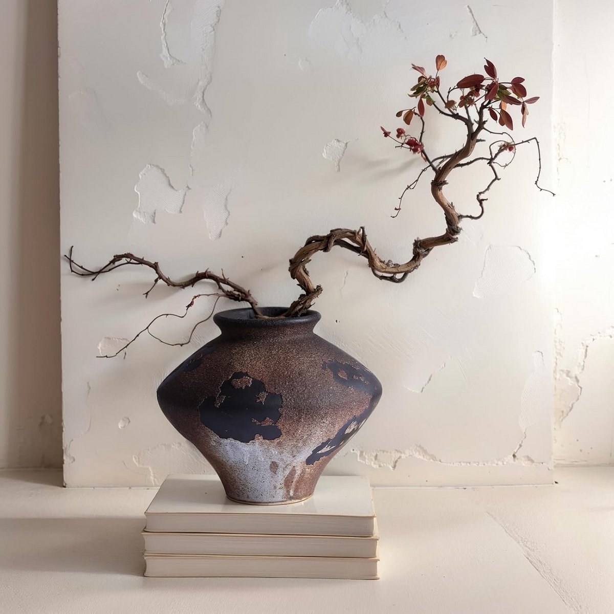 Handgemaakte keramieken vaas met een antieke uitstraling — perfect als decoratief middelpunt.