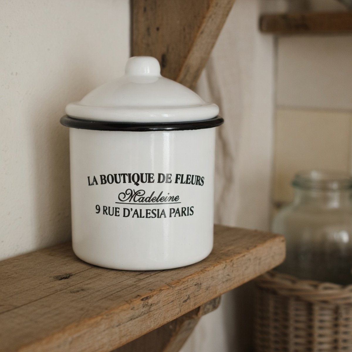 Sfeervolle emaille pot of accessoire in Franse brocante stijl — perfect voor de nostalgische keuken.